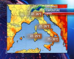 Oggi nuvole in aumento su tutte le regioni settentrionali con rovesci e temporali che nel pomeriggio bagneranno soprattutto Alpi e Piemonte, per poi estendersi in serata anche a Lombardia e Liguria. Un po’ di nuvolosità innocua anche in Toscana e Umbria, prevalenza di cielo sereno invece nel resto d’Italia. Temperature massime in calo al nord-ovest, dove la colonnina di mercurio rimarrà in generale sotto i 30 gradi; caldo in leggero aumento al contrario al centro-sud, con massime per lo più comprese fra 30 e 35 gradi. Venti per lo più di debole intensità.